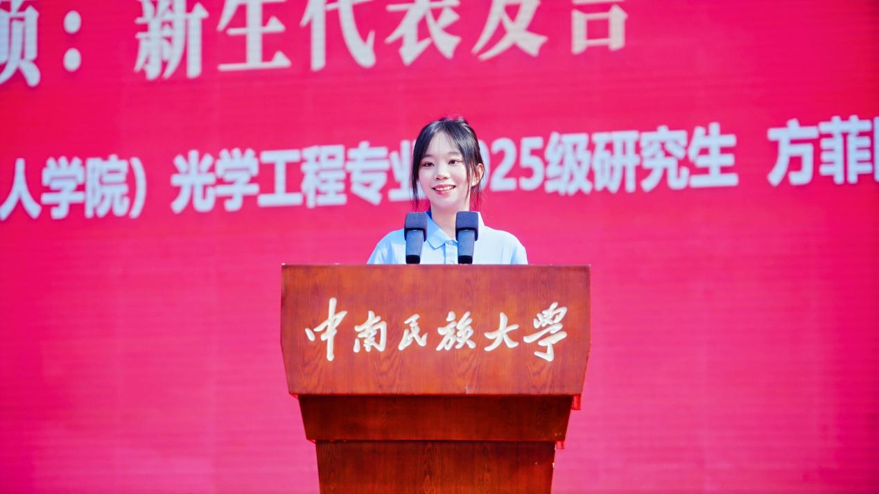 新生代表、电子信息工程学院(机器人学院)2025级光学工程专业研究生方菲表示,将扎根专业领域,以科技创新服务国家发展,希望同学们以青春之我、奋斗之我,为牢不可破的中华民族共同体建设贡献力量。