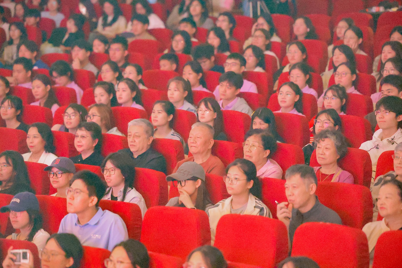当日下午,大礼堂内庄重温馨。白瑞西先生家属、新进教职工代表、研究生支教团全体在校学生、部分教师和学生代表共同观看首场演出。在戏剧艺术的沉浸演绎中,青年教师们溯源师者初心,感悟教育使命。教育家家属的到场,让历史叙事更显真实厚重,为现场观众搭建起跨越时空的精神对话。当晚,新生专场在大礼堂开启。话剧通过直播形式同步呈现于南湖中心运动场,2025级新生共同观看了这场特殊的“大思政课”。