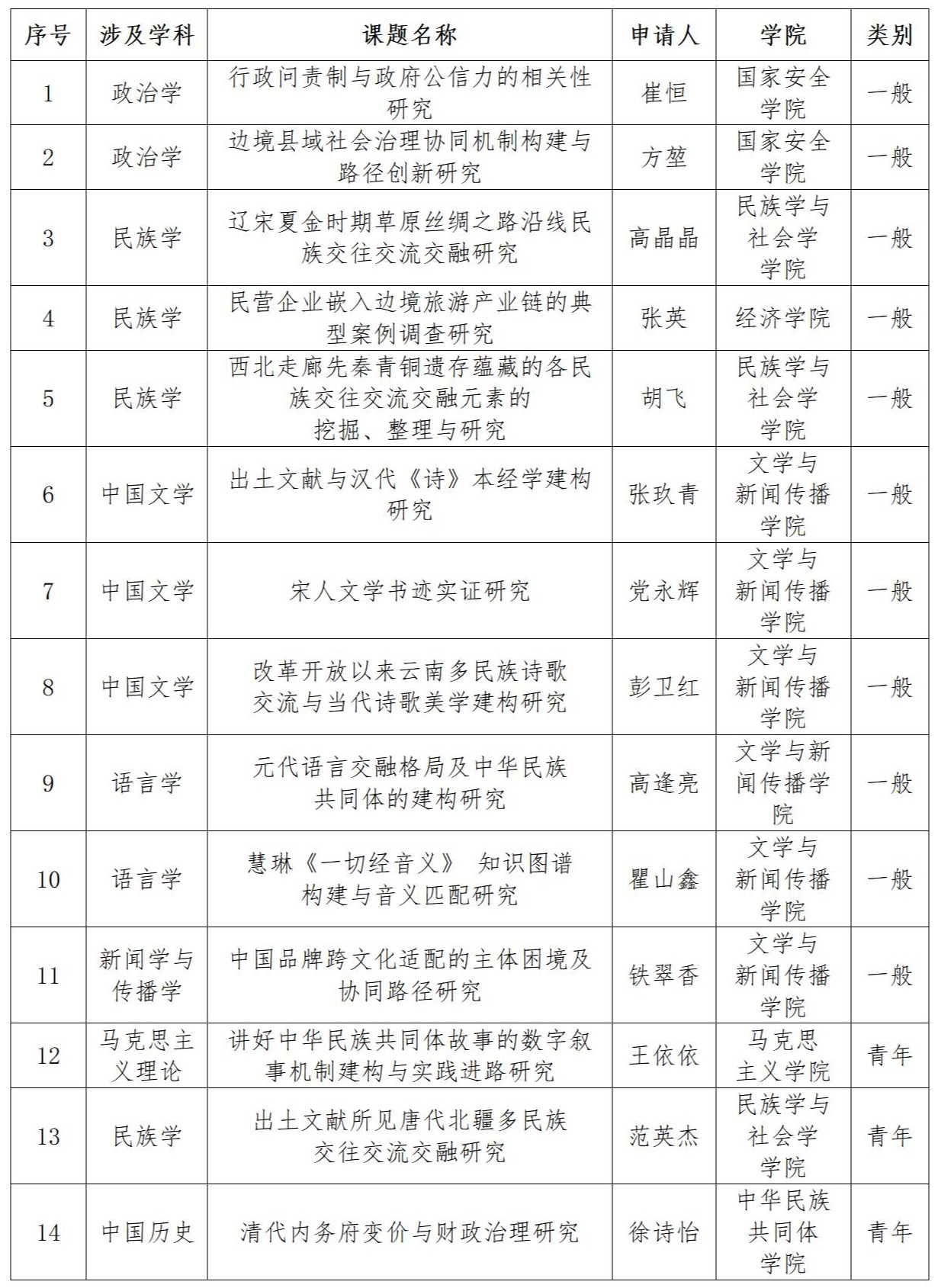 本次国家社科基金年度项目立项项目覆盖7个学科,其中,民族学获批立项4项,中国文学获批立项3项,语言学、政治学各获批立项2项,马克思主义理论、新闻学与传播学、中国历史各获批立项1项。