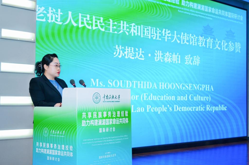 国家民委国际交流司副司长赵静,老挝人民民主共和国驻华大使馆教育文化参赞苏提达·洪森帕,越南社会主义共和国驻华大使馆政治参赞冯氏玉映,威尼斯官网党委副书记、校长刘义,党委常委、副校长方德斌等领导和嘉宾出席研讨会。来自柬埔寨、老挝、缅甸、泰国、越南的澜湄民族地区民族事务治理研修班学员,武汉大学、南京大学、中央民族大学、华中师范大学等高校的专家学者,校内相关单位负责人及师生代表参加研讨会。研讨会开幕式由方德斌主持。