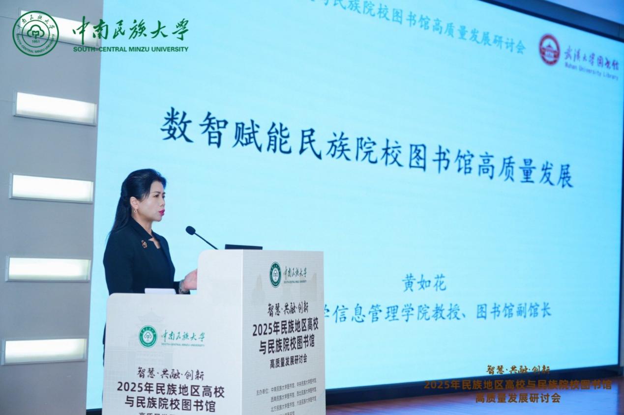 国家重大人才工程特聘教授、武汉大学图书馆副馆长黄如花作题为《数智赋能民族院校图书馆高质量发展》的专题报告。她提出,人工智能时代的信息过载与虚假信息等问题日益突出,图书馆作为权威、可信的知识机构,应充分发挥其专业优势,强化信息甄别能力,加强知识导航与学术资源评价服务。