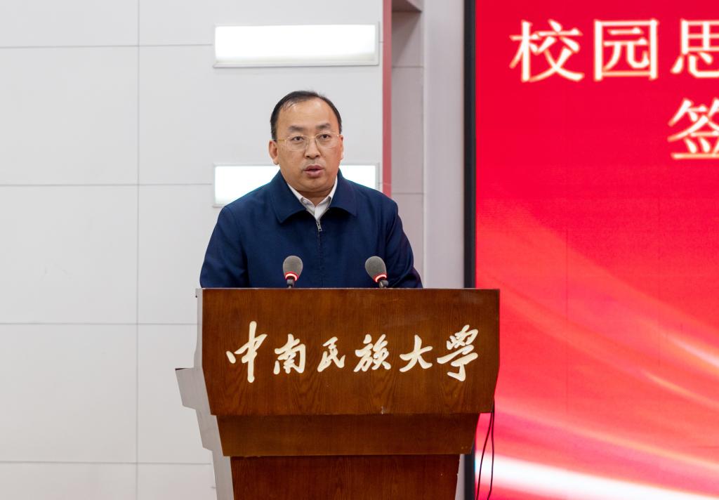 在全体师生代表的共同见证下,马玉堂与谢云签订合作协议。徐业勤与朱雨龙共同为“校园思政影视教育基地”揭牌。