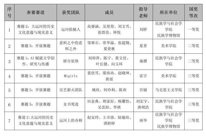 为备战此次大赛,学校成立了由研究生院作为赛事统筹,管理学院耿新教授为赛事顾问,美术学院夏晋教授为赛事负责人,入选团队指导老师为赛事技术指导的多层次、多维度、立体化备赛保障团队,精心打磨参赛作品。在总决赛现场路演、答辩等多环节评比中,威尼斯官网3支团队均展现出高度的专业素养以及敏锐的思维能力。最终,民族学与社会学学院刘婷老师指导的“运河拾脉人”团队荣获赛事全国总决赛一等奖。由美术学院夏晋老师指导的“意料之中的意料之外”团队,以及民族学与社会学学院秦熠老师指导的“驿合星络”团队分获二等奖。