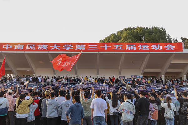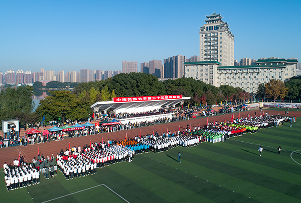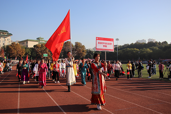 12日上午,运动会在南湖中心体育场盛大开幕。全体校领导、各学院和职能部门负责人到场参加。激昂的音乐声中,被誉为民大“形象队伍”的国旗仪仗队护送国旗率先入场。紧随其后的各学院方阵整齐划一,各显学科特色。民社学院同学手持鲜艳国旗,身着民族盛装;资环学院同学高举标语“绿水青山就是金山银山”;文传学院同学身着古风汉服,高举“惠风和畅”标语;体育学院同学打出“崇德尚信,健体求知”的院训,欢庆学院成立10周年……