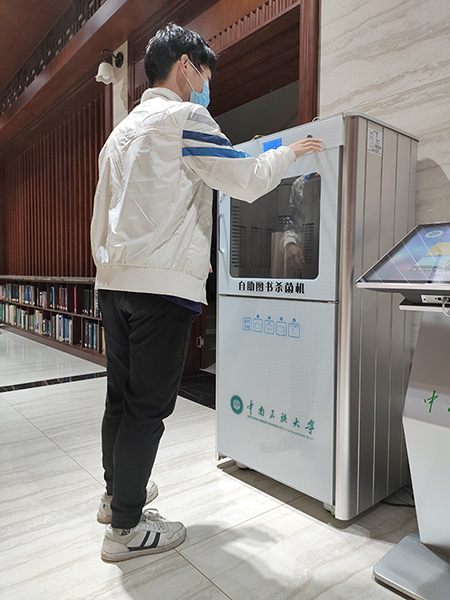 学生正在使用自助图书消毒杀菌机。刘芝妞 摄