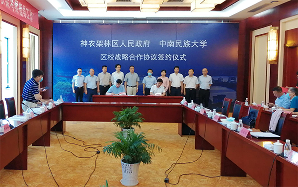7月20日,学校与神农架林区人民政府签订战略合作协议,神农架林区党委副书记、区长刘启俊,党委副书记、政法委书记罗栋梁,副区长李金玲、潘泽江,校党委副书记、校长李金林,党委副书记、副校长宋发军,区校双方相关单位负责人出席签约仪式。