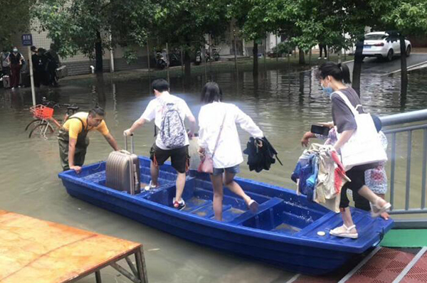 入梅以来,武汉市连日多雨,6月28日至29日上午,普降特大暴雨,毕业生返校路艰难而又温馨。29日,校党委副书记、副校长宋发军和学工部、校团委老师亲往火车站,迎接最后一批返校的毕业生。住北区学生公寓的同学自南区走过天桥,映入眼帘的是一条蓝色的小舟,后勤保障处的师傅挽舟涉水,送他们前往寝室。这是威尼斯官网防涝抗洪工作的一个缩影。