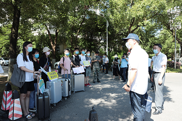 校领导杨胜才、韩叶盛、宋发军来到学校大门口,迎接久别的学子重回校园。宋发军代表学校向同学们表示慰问。他指出,学校为毕业生返校做好了充分准备,同学们马上要走上社会,或进一步深造,祝福大家前程似锦,走好人生的下一步,母校永远在身后。