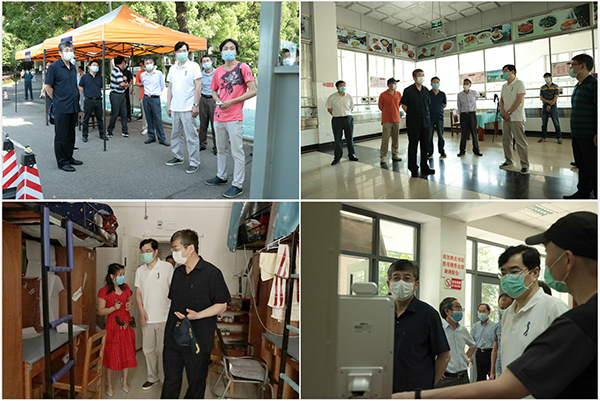 从学校正大门到学生三食堂,到本科生宿舍、留学生宿舍、图书馆北书苑、北区研究生宿舍、16号教学楼,再到北二门,校领导亲身试用师生健康安全综合管理平台,对校园进出常态化管理、毕业生返校等相关工作提出了指导意见。在食堂,他们对当前在校学生进餐情况和返校毕业生饮食安排一一细问落实。在本科生、研究生、留学生宿舍,他们悉心关注学生学习、生活和健康情况。