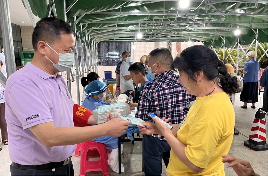 在核酸检测现场,社区居民沿着标志按顺序排队,有序等待核酸采样。社区工作人员和下沉党员在居民等待核酸检测的间隙,为居民送上印有“廉”字的防疫口罩和印有社区廉洁宣传二维码的纸巾,居民用手机扫描二维码即可学习清廉文化知识。