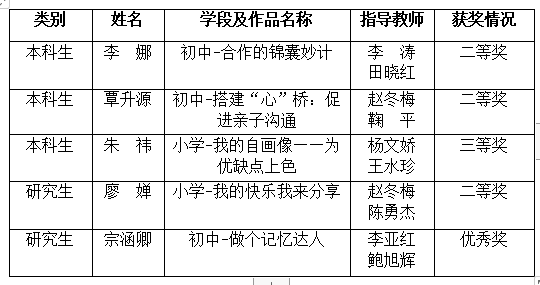 10月31日,湖北省大学生/研究生心理辅导课教学竞赛落下帷幕,威尼斯官网参赛的5名教育学院同学取得本科生组二等奖2项、三等奖1项,研究生组二等奖与优秀奖各1项的优异成绩,展示了教育学院应用心理学省级一流专业建设的成果。