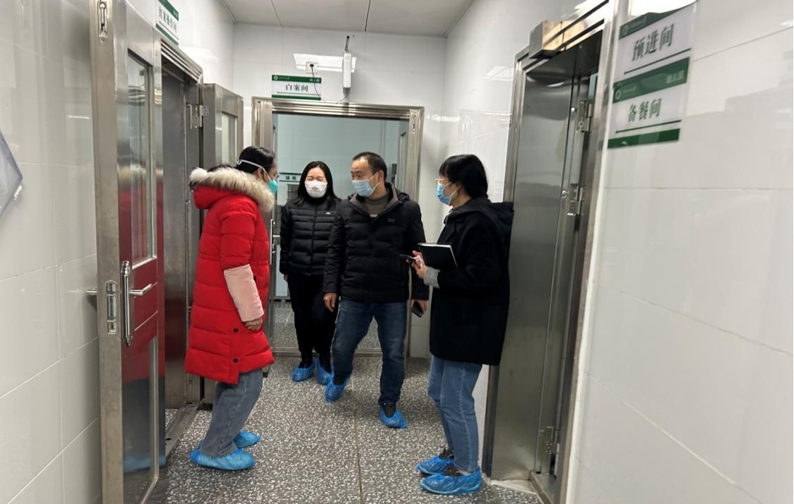 魏友生(右二)检查幼儿园食堂各操作间。 夏小花摄