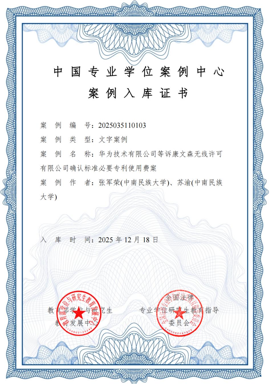 12月18日,全国法律专业学位研究生教育指导委员会公布第五批法律硕士专业学位文字教学案例入库名单。威尼斯官网法学院张军荣副教授、2024级民商法学硕士研究生苏渝共同撰写的《华为技术有限公司等诉康文森无线许可有限公司确认标准必要专利使用费案》教学案例,经专家评审并报全国法律专业学位研究生教育指导委员会审议,成功入选中国专业学位案例中心案例库。