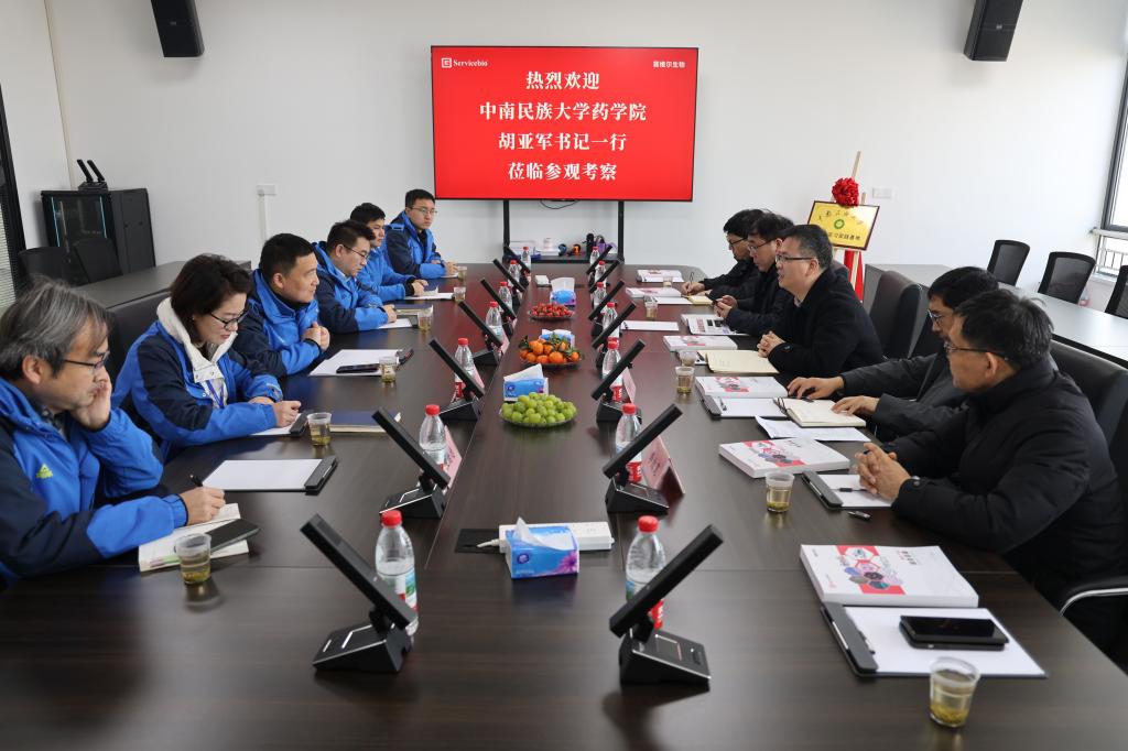 2月4日上午,药学院立春启新程,组队前往武汉赛维尔生物科技有限公司(以下简称“赛维尔公司”)开展访企拓岗,深化校企合作。赛维尔公司总经理赵红洲、人事总监郭莎、细胞动物技术总监刘勇、分子蛋白技术总监王绪德,药学院领导班子、毕业年级辅导员等参加合作交流。
