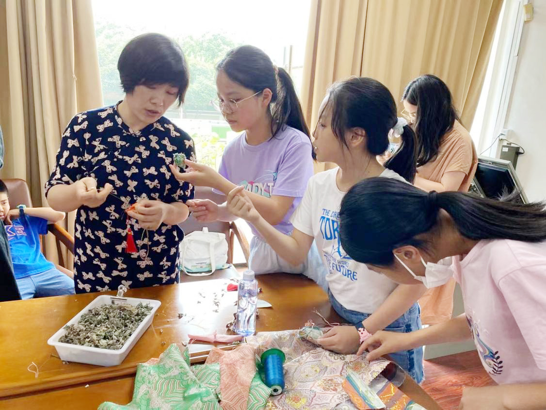 小朋友们裁剪布料,制作精美香囊。  龚唯  摄