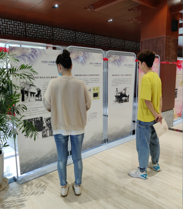 展览以“马克思主义传播在中国”为主题,以历史文献为支撑,以编年体的形式生动形象地展现了百年来马克思主义在中国的传播历程。展览包括44幅版面,“西学东渐——近代中国马克思主义的最初译介”、“必由之路——十月革命促进了马克思主义在中国的传播”“万象更新——建党后马克思主义著作的翻译、出版和传播” “劈波斩浪——白色恐怖下传播真理的壮丽诗篇”“源头活水——延安时期开启马克思主义中国化的新时代”“理论飞跃——新中国经典著作编译工作的整体推进”六个部分依次布展,吸引众多师生参观学习。