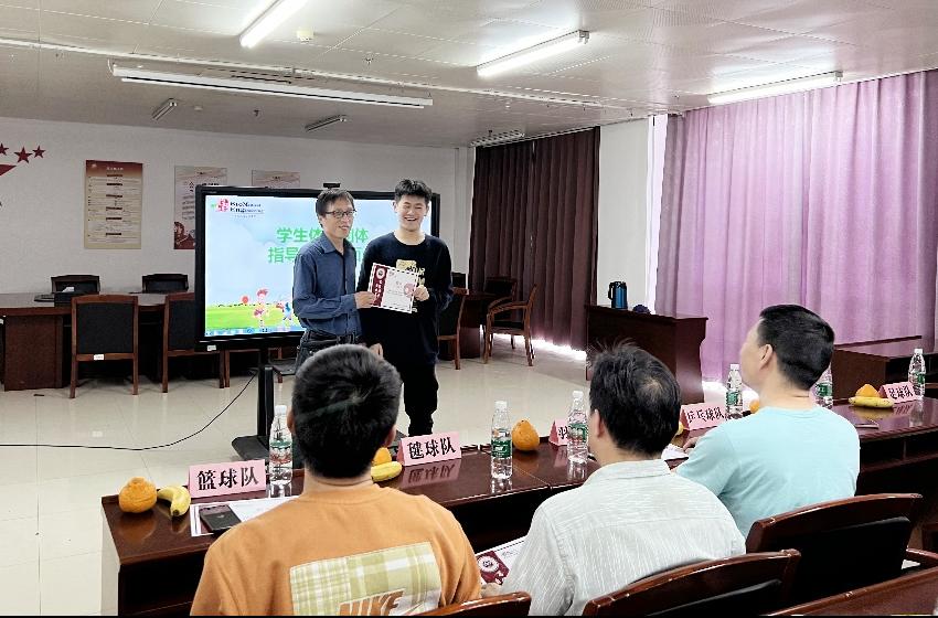 在轻松友好的氛围中,主持人介绍了学院为各学生体育团体聘请指导老师的初衷和意义,并向各球队学生代表隆重介绍了学院首批担任学生体育团体指导老师的6位专任教师。6位老师中,有年过半百但在球场上体力跑赢年轻人的3级教授李臣鸿老师,有青年学者南湖论坛引进的海外优秀人才——33岁硕导闵加威老师,还有以严格、严肃闻名于学生但酷爱羽毛球运动的副院长陈军波老师。老师们虽然来自不同学科方向,但都对体育运动和学生工作充满热情。院团委书记叶颖为各位老师颁发聘书,各学生体育团体队长和老师合影留念。