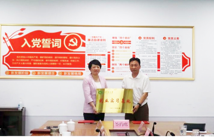 座谈结束后,体育学院院长郝家春代表学校与体育产业集团签订了人才供需合作协议,蔡琼为实习实践就业基地授牌。