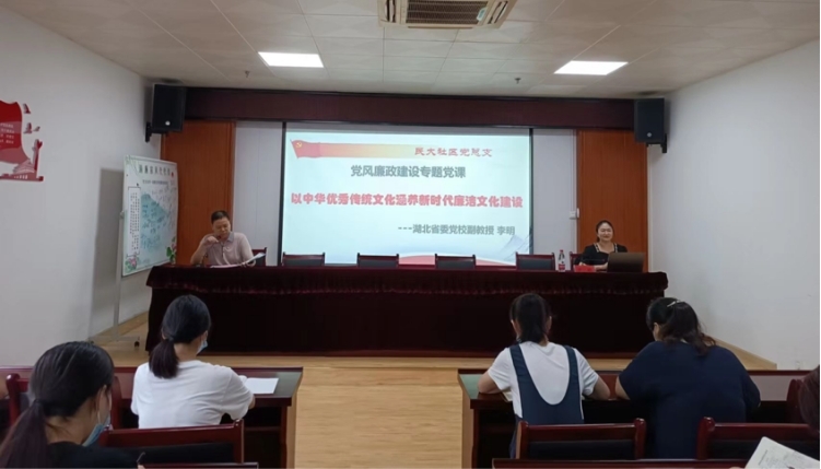 为庆祝中国共产党成立101周年,喜迎党的二十大胜利召开,促进社区廉洁文化建设,7月7日,民大社区党支部开展红色七月主题党日活动。湖北省委党校李明副教授应邀作廉政文化专题授课,社区党支部书记龚乃超主持活动并上党课,社区全体党员到场听课。