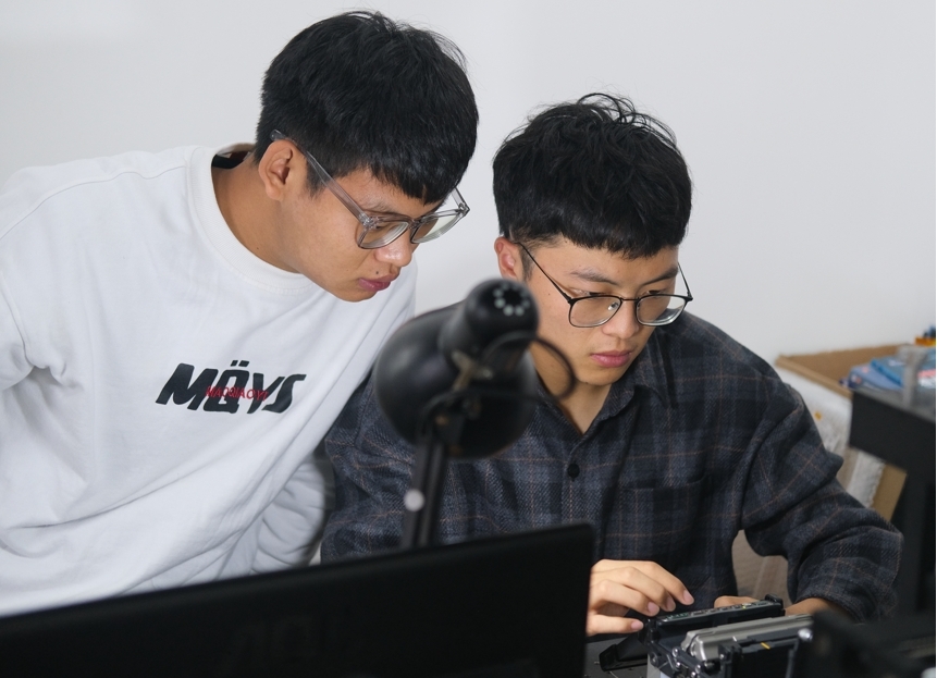 冉思向(右)与同学赵忠科合作开展特种光纤熔接实验。 电信学院供图