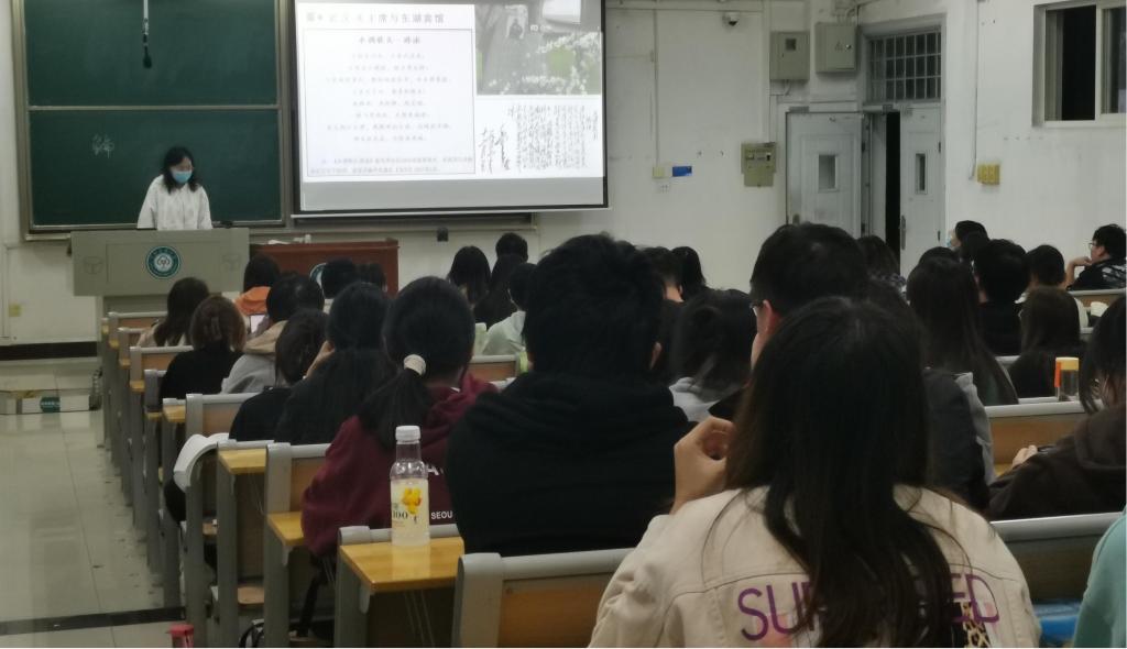 李东娟老师以东湖宾馆为例讲述酒店的红色故事,并带领学生集体诵读毛泽东诗词《水调歌头·游泳》。 管理学院供图