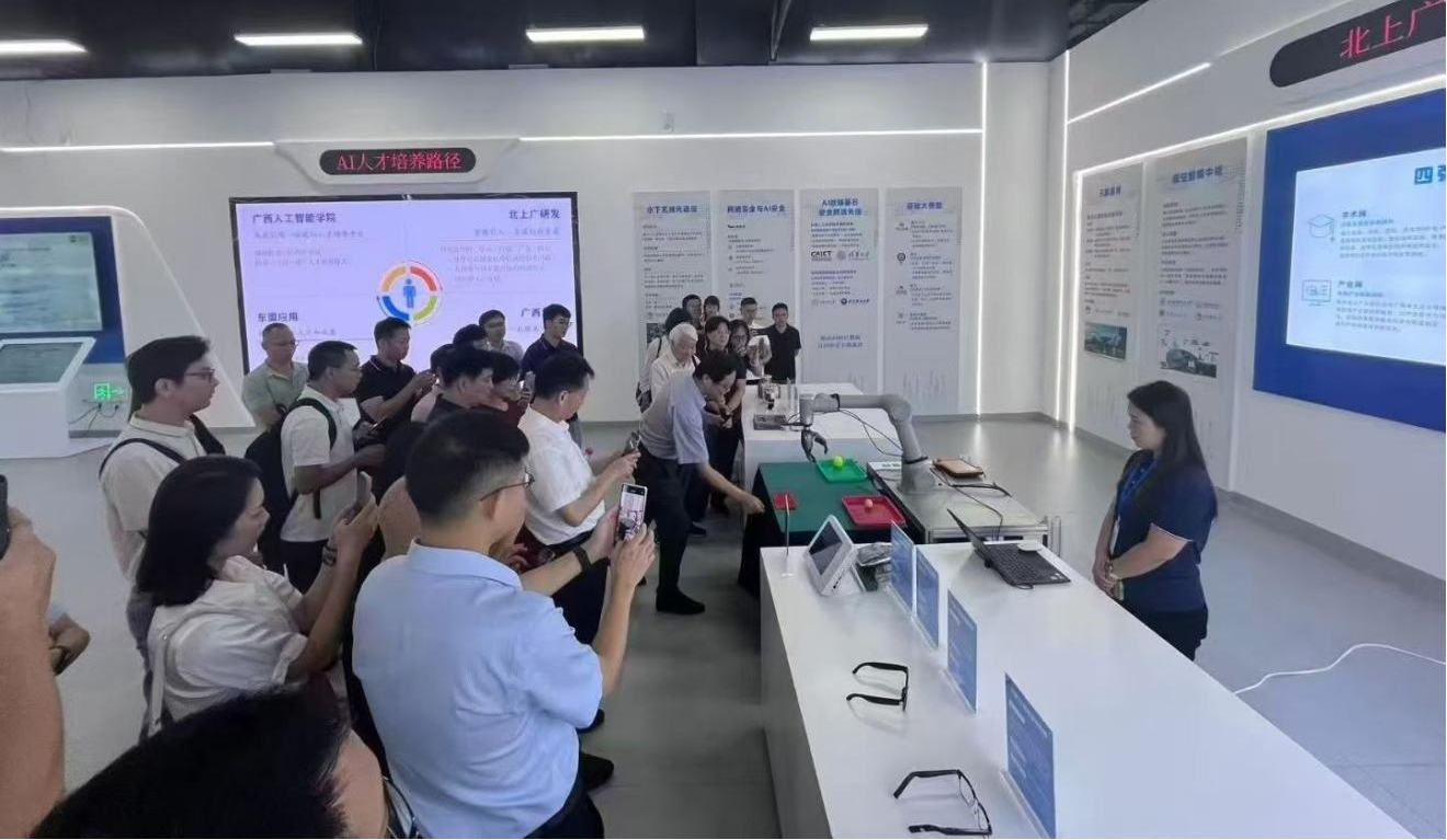 活动期间,杨巨成带领校友参观了广西人工智能学院的科研平台与创新成果。作为2025年4月获批成立的自治区级重点学院,该校依托桂林电子科技大学与香港科技大学(广州)的优势资源,聚焦机器人与具身智能、农林人工智能应用等21个核心研究方向,已形成“底层技术突破+产业深度赋能”的双轮驱动格局;与东盟国家共建的“跨境电商智能服务平台”已在老挝、泰国等地落地,通过AI技术提升贸易效率30%以上。