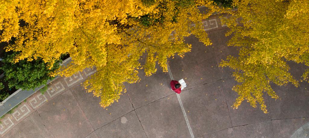 这组《秋日三叠》,是我们为秋天提交的一份层次丰富的答卷。首章,是流动的诗。高空俯瞰,红黄交织的树冠为街道披上秋衣,两名骑行者穿梭于暖柔的光影中,仿佛律动的音符,奏响了季节的交响序曲。次章,是静默的思。银杏树下,金黄浸染天地,少年独自沉浸在书页里。此刻,飘落的叶与翻动的书页私语,构成了一个内外丰盈的宁静宇宙。终章,是温暖的光。同样的金杏覆顶,成为一家人的闲适背景。怀抱的幼童、蹲下的身影,在秋景的包裹中,定格了比阳光更暖的亲情瞬间。