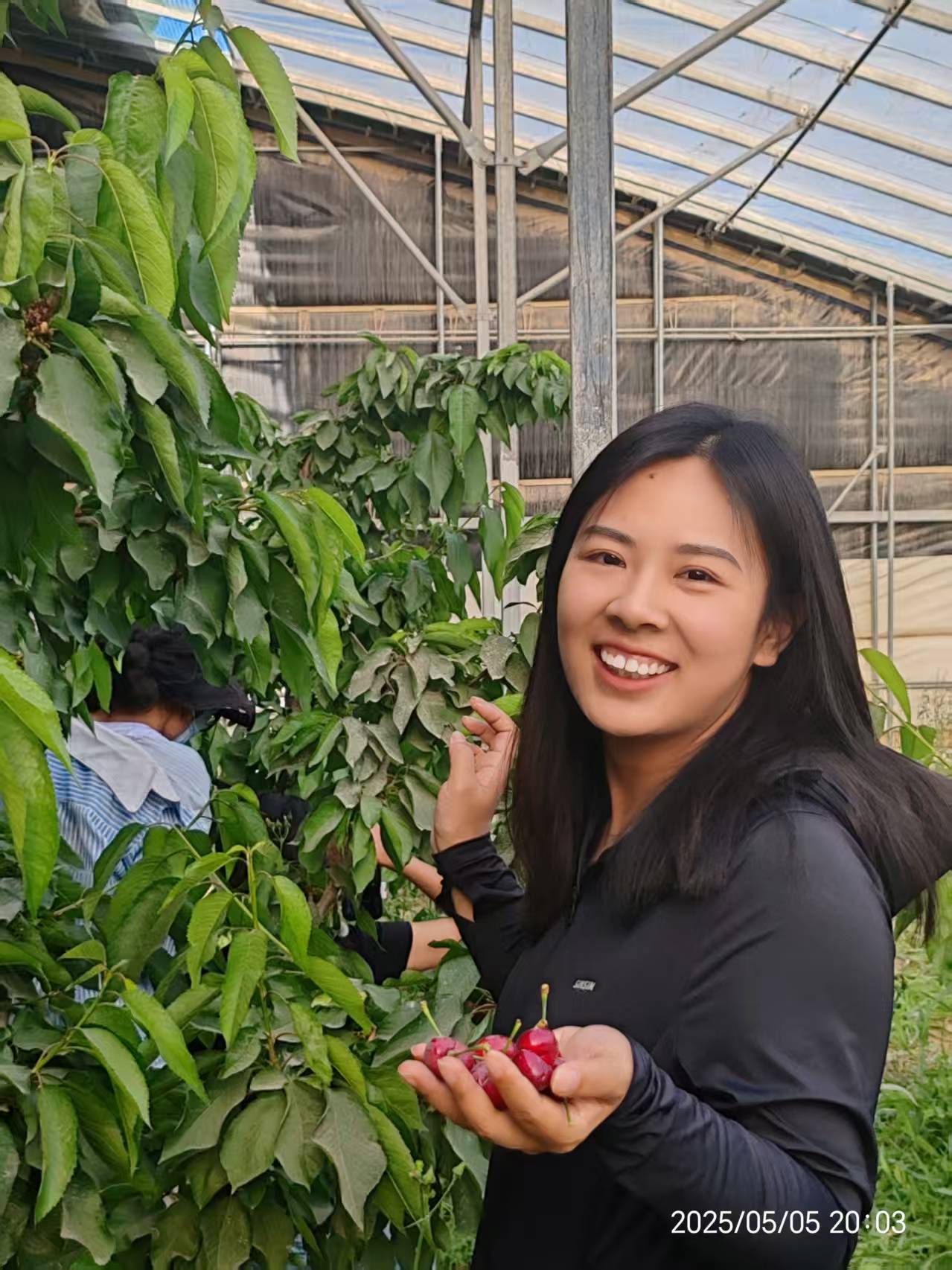 向莉蓉在库木库萨尔乡8村大棚樱桃园帮助农户宣传樱桃。