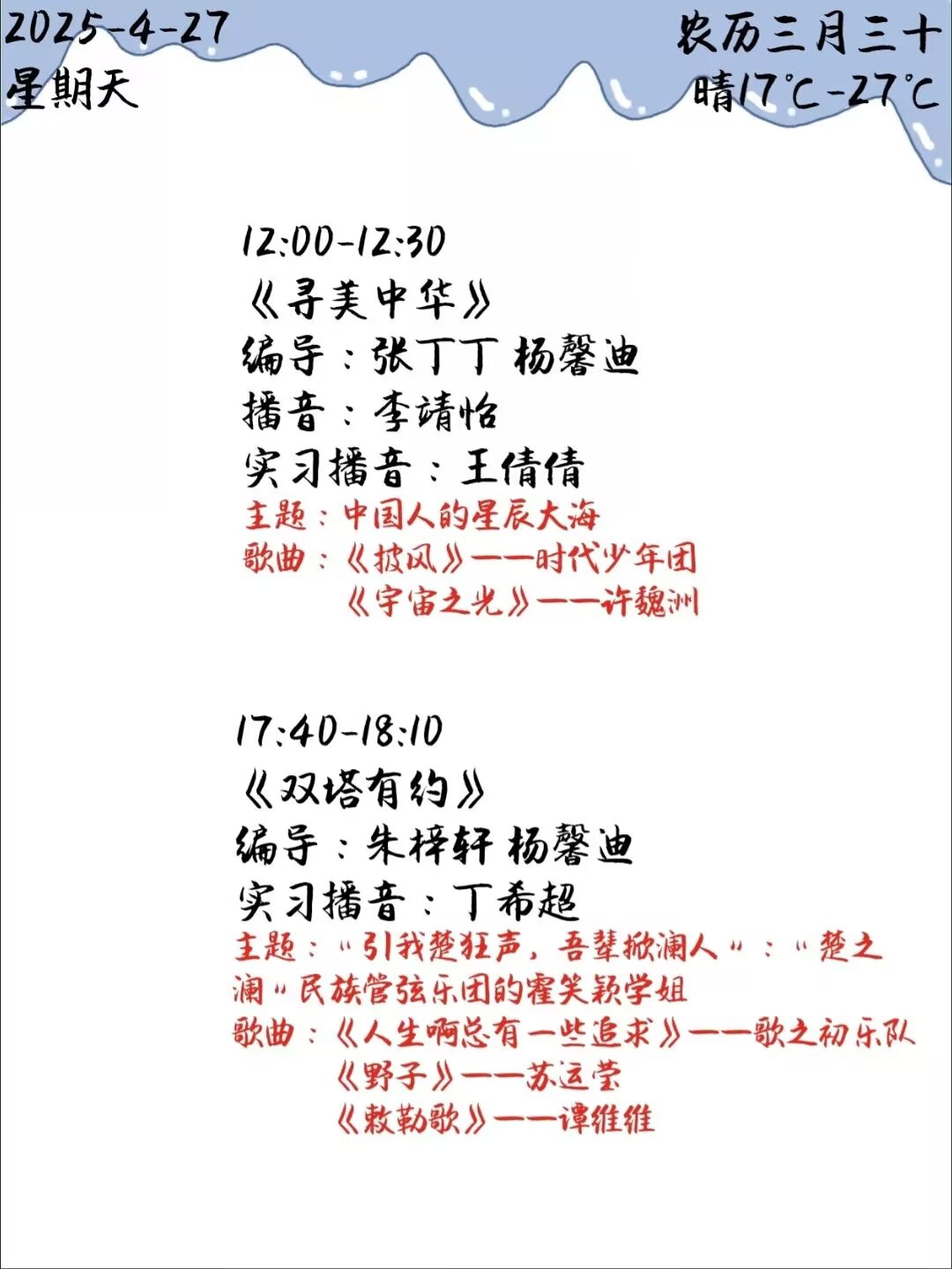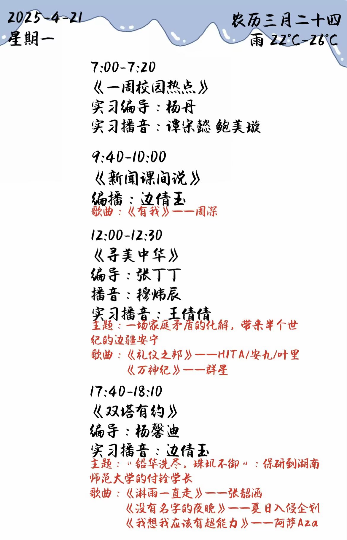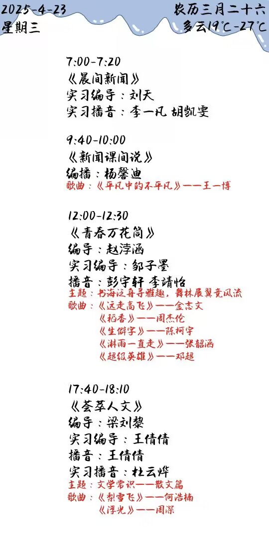 下一篇: 双塔之声2025年第一学期第8周节目单(2025.4.14-4.18)