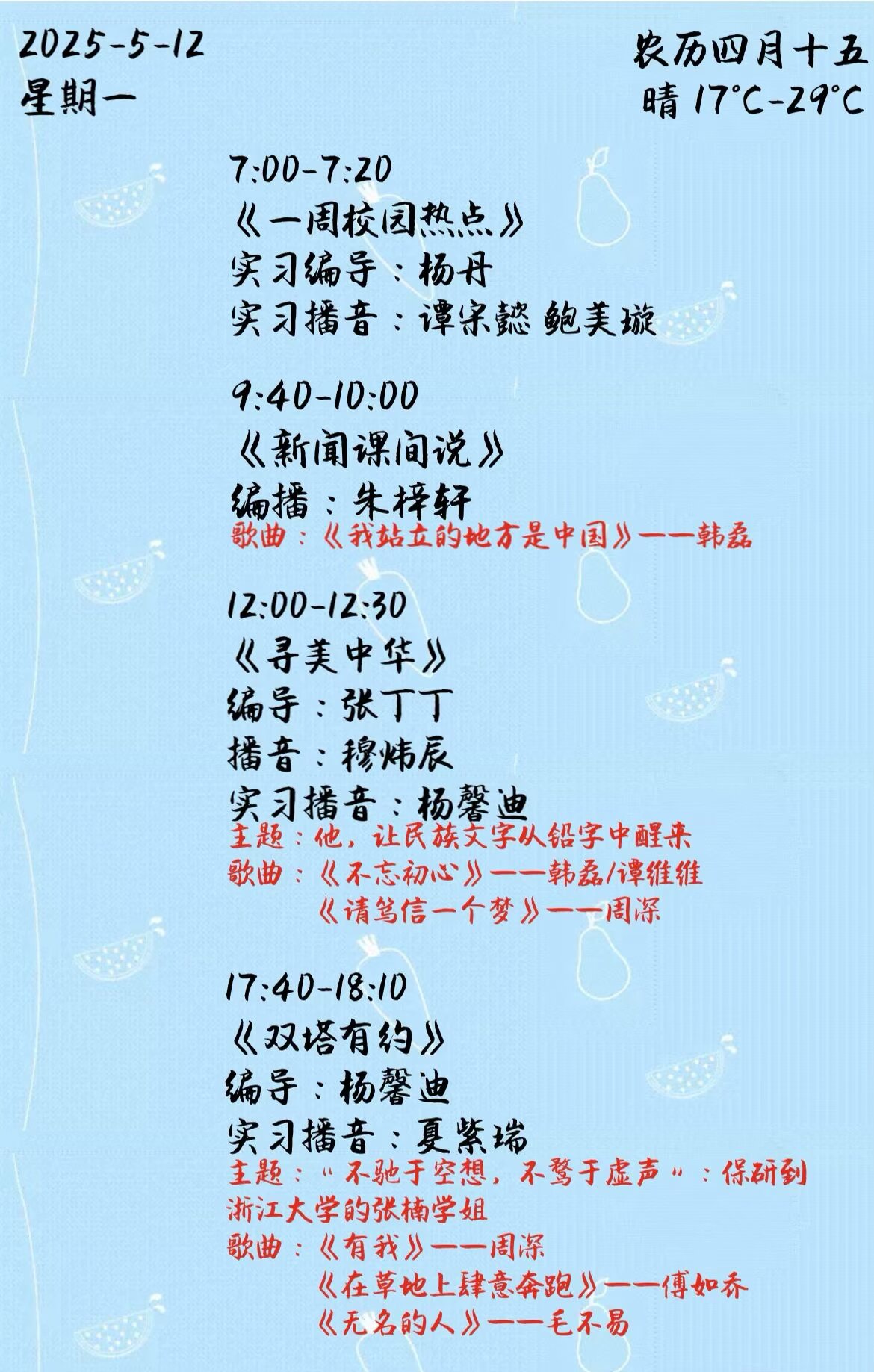 下一篇: 双塔之声2025年第一学期第11周节目单(2025.5.6-5.9)