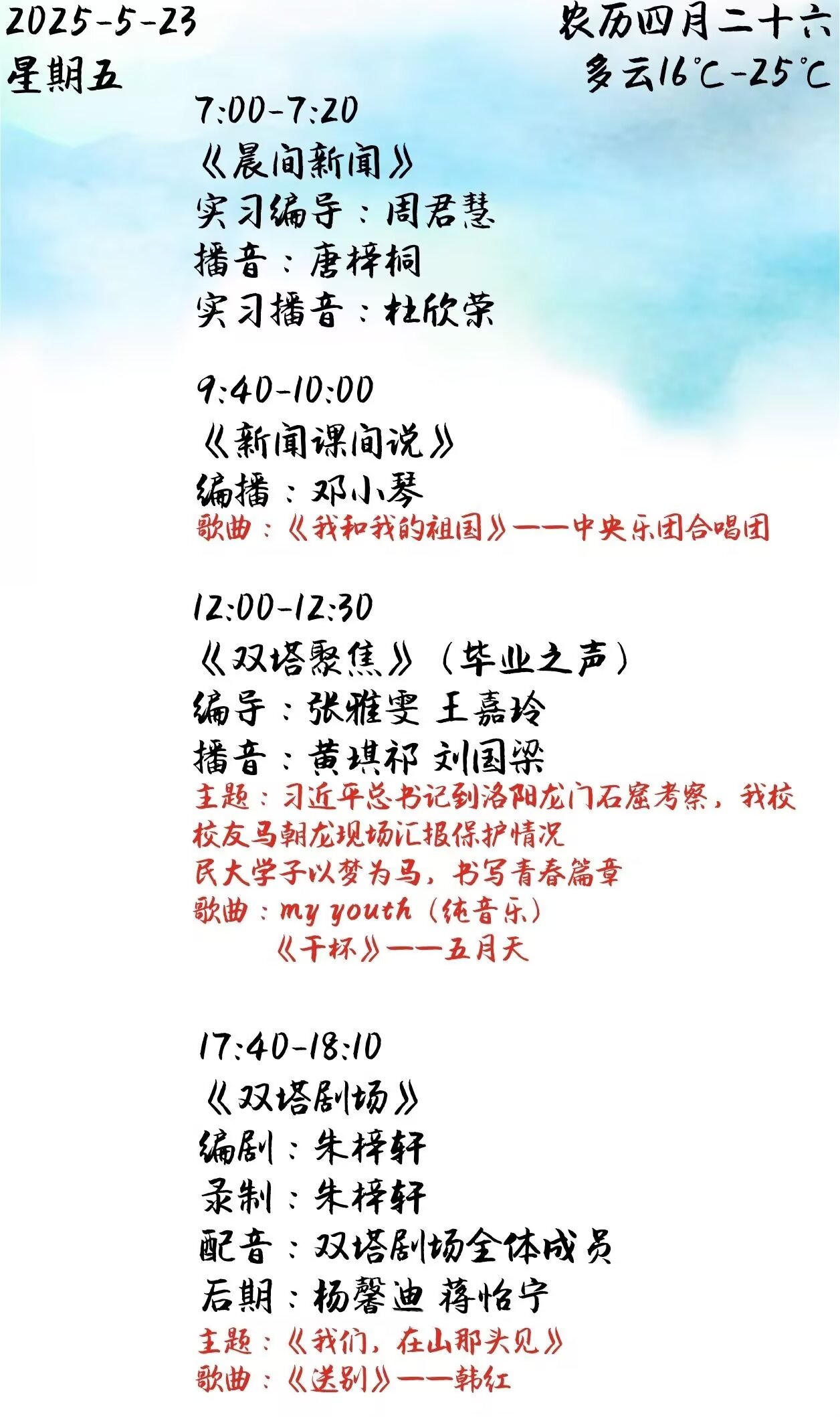 上一篇: 双塔之声2025年第一学期第14周节目单(2025.5.26-5.30)