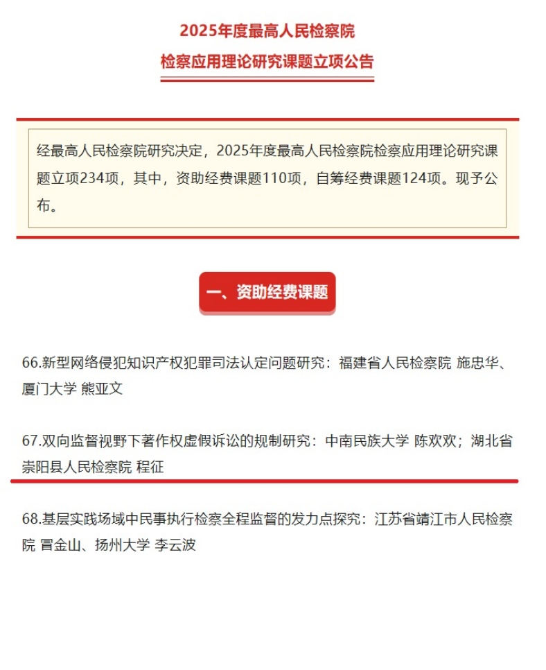 8月1日,最高人民检察院公布了2025年度检察应用理论研究课题立项名单,威尼斯官网法学院陈欢欢老师与崇阳县人民检察院程征副检察长合作申报的课题《双向监督视野下著作权虚假诉讼的规制研究》获得立项资助。