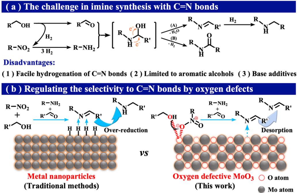 不饱和C=N键的选择性构建在化学和生物学中非常重要,因为具有C=N键的有机含氮化合物,如亚胺和氮杂环化合物广泛应用于精细化工、材料科学、药物研究、染料和颜料工业等领域。众多的合成方法中,“借氢”策略可以直接使用来源广泛、稳定的醇和硝基化合物作为原料,在催化剂作用下,醇先脱氢生成醛,硝基化合物被原位还原为胺,两者再缩合生成目标产物。张泽会教授团队在前期含氮化学品合成研究基础上,制备了一种氮掺杂碳材料负载的富含氧空位钼氧化物纳米颗粒(Mo/NC-500)催化剂,可用于催化包括甲醇、乙醇在内的广谱性醇和硝基化合物还原偶联合成超过80个结构多样的亚胺、苯并唑和喹喔啉类有机含氮化学品,并实现活性药物分子合成。这项工作为有机含氮化学品的绿色合成提供了一个新思路。