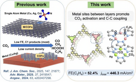 将CO₂电化学还原为乙烯(C₂H₄)为减少温室气体排放并生成高价值化学品提供了一种有前景的途径。然而,对于单原子催化剂而言,同时实现高C₂H₄选择性和长期催化剂稳定性仍然是一项重大挑战,这主要是由于缺乏反应中间体耦合所需的相邻活性位点。研究团队开发了一种具有精确可调Cu-Ag空间构型的双金属金属-共价有机框架(MCOF),通过协同催化机制增强CO₂向C₂H₄的转化。通过将Cu/Ag摩尔比优化至1:1(Ag₀.₅Cu₀.₅-CTC-TAPT),该催化剂在-1.774 V vs RHE还原电位下,实现了51.5% ± 0.9%的C₂H₄法拉第效率(FE(C₂H₄)),同时具有439.0 ± 7.3 mA cm⁻²的电流密度和优异的稳定性(10小时内FE(C₂H₄) > 40%),其性能优于大多数主要产生C1产物的单金属MCOFs和MOF基电催化剂。原位光谱分析和机理研究表明,Ag位点主要促进CO生成,而相邻的Cu位点则促进C–C键形成。该研究提出了一种构建具有相邻异质金属活性位点的COF基材料的新颖设计策略,突显了其在将CO₂电化学转化为有价值C2+化学品方面的巨大潜力(图2)。