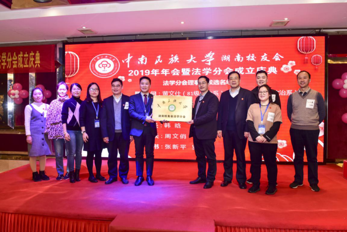 随后,举行了中南民大湖南校友会法学分会成立仪式。仪式上,通过了法学分会的理事会名单,法学院领导为湖南校友会法学分会进行了授牌。87级计科校友宿勇为参会校友分享了自己的创业经历和感悟。