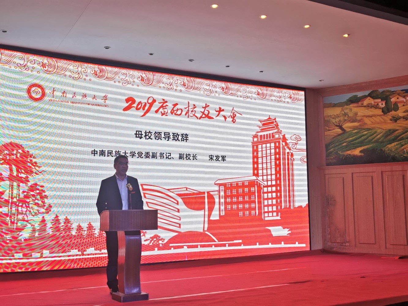 宋发军代表学校向广西校友大会成功举办、向广西校友企业之家“广西火之舞投资有限责任公司”及广西校友会法学分会的成立表示热烈地祝贺。他充分肯定了广西校友会的工作,介绍了近年来学校在人才培养、科学研究、社会服务和“双一流”建设等方面所取得成绩。他说,广西校友企业之家和行业校友分会的成立,为学校校友工作在助推校友发展、凝聚校友力量方面提供了新的思路。他对广西校友会工作提出两点希望,一是希望广西校友会认真总结经验,勇于创新,积极作为,进一步凝聚校友力量,把校友服务平台做大做优做实做强,为广西各地经济建设、政治建设、社会建设、文化建设、生态文明建设贡献“中南民大人”的智慧和力量。二是希望校友们不断密切母校—校友的联系,积极为母校的发展献计献策、共谋发展,深化与母校在学科建设、产学研结合、学生实习就业、助困助学、社会服务等方面的合作,积极打造母校校友发展共同体。