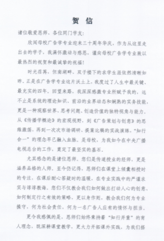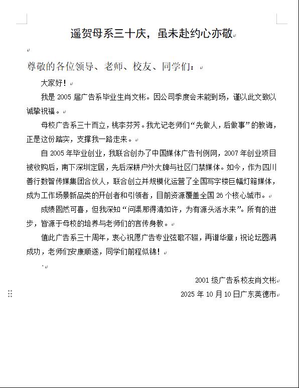虽不能至,心向往之。在庆典筹备期间,多位校友虽身处四方,仍以贺信传递深情。01级肖文彬、03级涂锦涛、04级段广宏等校友,纷纷以书信形式,向文学与新闻传播学院的师生及校友致以热烈祝贺与诚挚祝福,字里行间尽显对母校的眷念与对专业发展的热切关注。