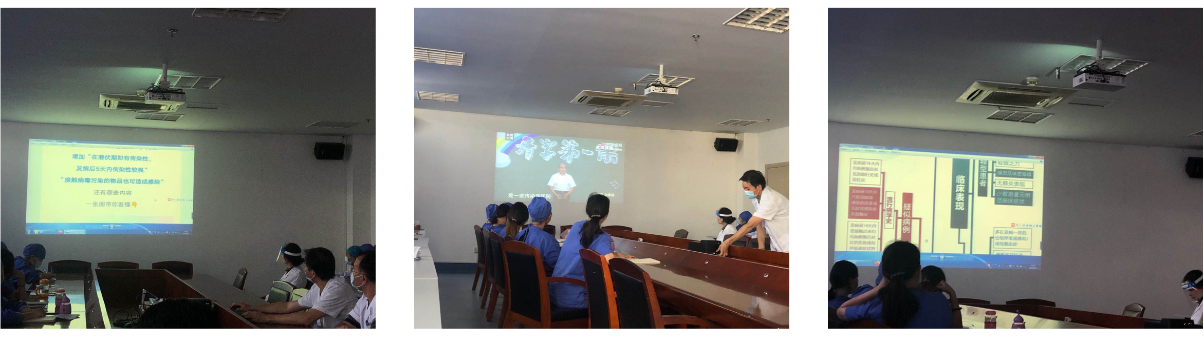 图1. 全体职工召开2020年秋季学期开学工作会议 会议还传达了学校日前召开的2020年秋季开学干部会议及校党委理论学习中心组有关会议精神,同时传达了省委教育工委转发的中共教育部党组、中共中央纪委机关、中共中央组织部、中共中央宣传部《关于加强高校党的政治建设的若干措施》的通知文件。 按照文件精神,医院党总支书记钟利提出了五点要求:一是抓好政治理论学习,守好意识形态阵地,夯实基层党组织建设;二是加强业务学习,强化医务人员职业技能培训,坚持请进来,走出来,着重培养各科室青年骨干医师,有步骤有计划地安排外出学习、培养;三是加强团结,听从指挥,服从安排,要增强“四个意识”:政治意识、大局意识、核心意识、看齐意识;四是站好自己的岗,做好学校70周年校庆准备工作;五是按照院感要求做好常态化疫情防控工作。 最后,院长龚艳带领全体医务人员共同学习了国家卫健委办公厅、国家中医药管理局办公室印发的《新型冠状病毒肺炎诊疗方案(试行第八版)》,并集体观看央视视频《开学第一课》。 图2. 医务人员开展业务学习和培训