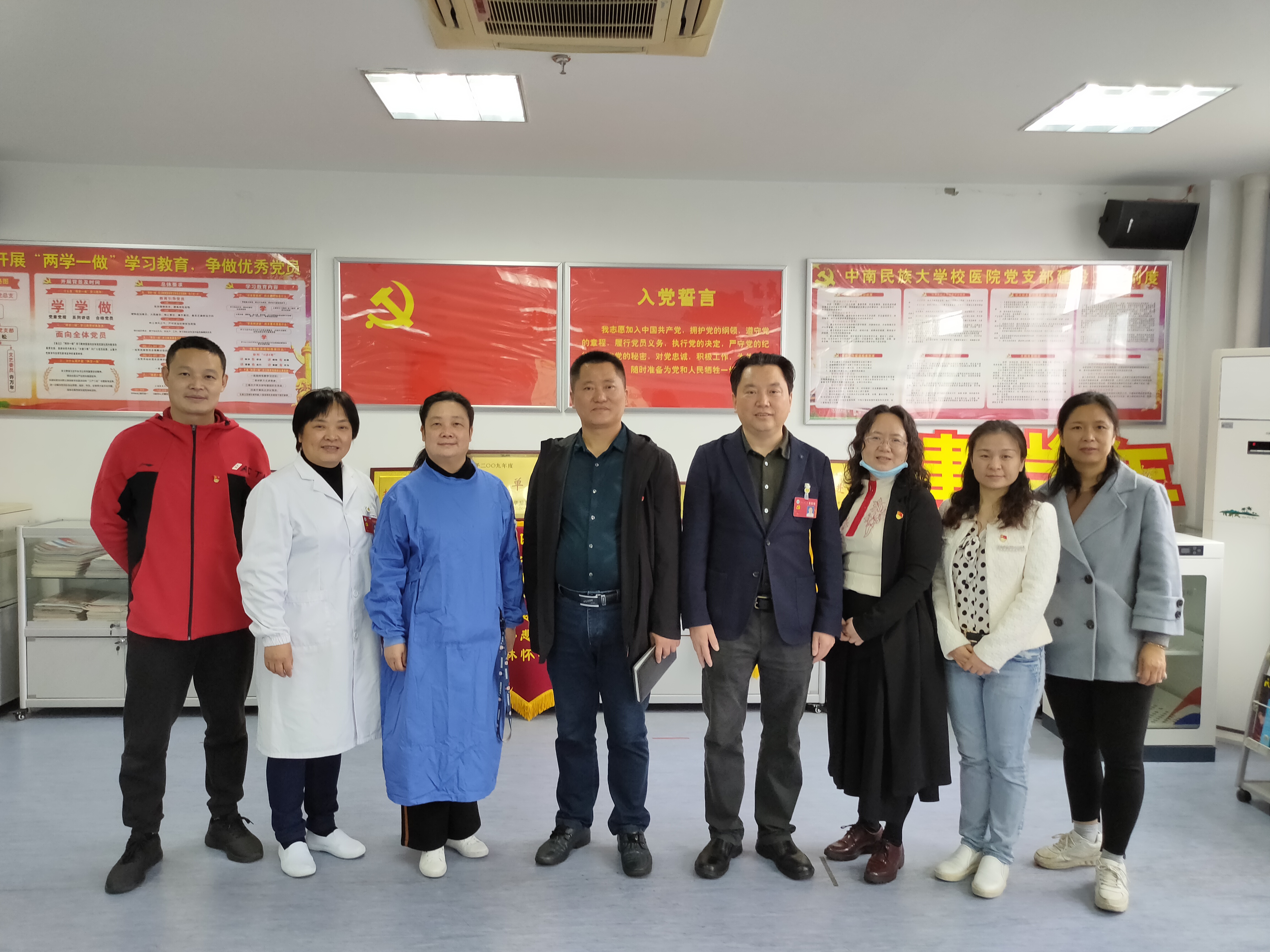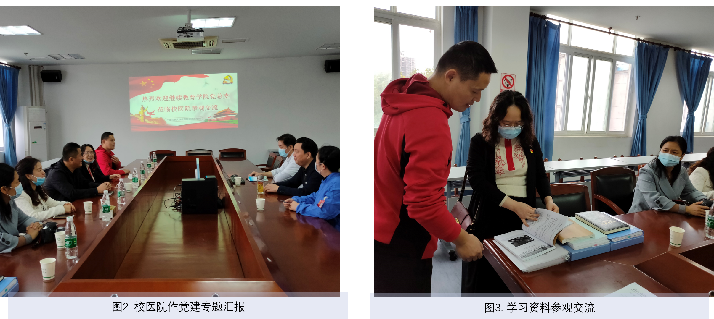图1. 校医院党总支与继续教育学院党总支开展“联学共建”学习交流活动 当日上午10点,“联学共建”学习交流活动正式开始。继续教育学院党总支书记洪盛志、副院长胡晶晶等一行5人来到我院交流学习,校医院党总支书记钟利和院长龚艳对各位同仁的到来表示热烈欢迎。 活动中,钟利书记就我院党建工作进行简要介绍,并带领继续教育学院同仁参观了解我院整体环境、“党员示范岗”、党建宣传标识以及党建重点科室。随后,公共卫生科党员医师杨冰就校医院党建工作进行专题汇报。