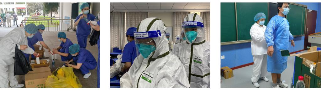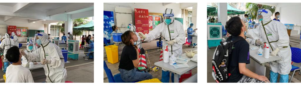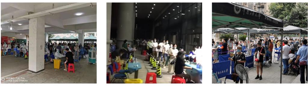 本轮核酸检测采样工作分为三组,分别由校医院和首义医院的医护人员承担。从下午1点开始准备核酸采样现场,耗时一个半小时搭建了三处核酸采样点,分别位于校内10号楼、16号楼和东家属区教工活动中心。医护人员经过紧张的培训后,于下午3点正式开始核酸检测工作。