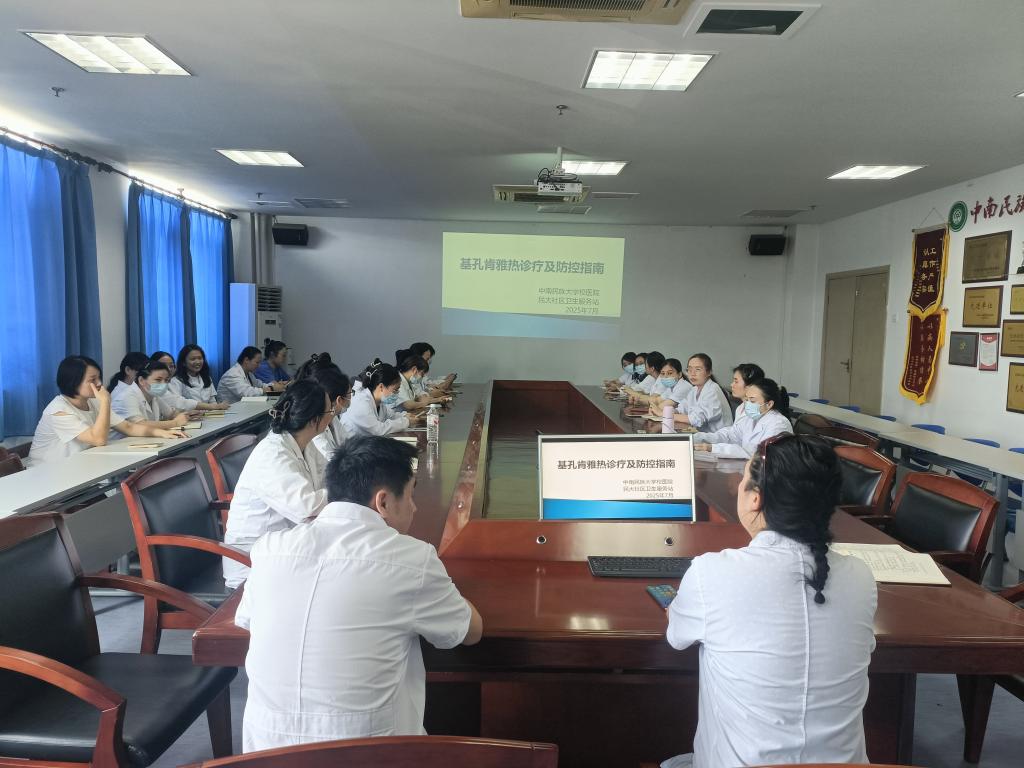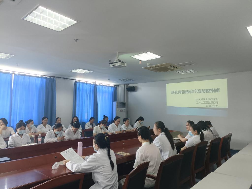 为进一步提升医务人员对基孔肯亚热的防控和诊疗能力,做好蚊媒传染病疫情应急处置准备,校医院于7月28日组织开展了《基孔肯雅热诊疗及防控指南》专题培训。医院领导班子高度重视,全体医护人员参会,会议由院长龚艳主持。