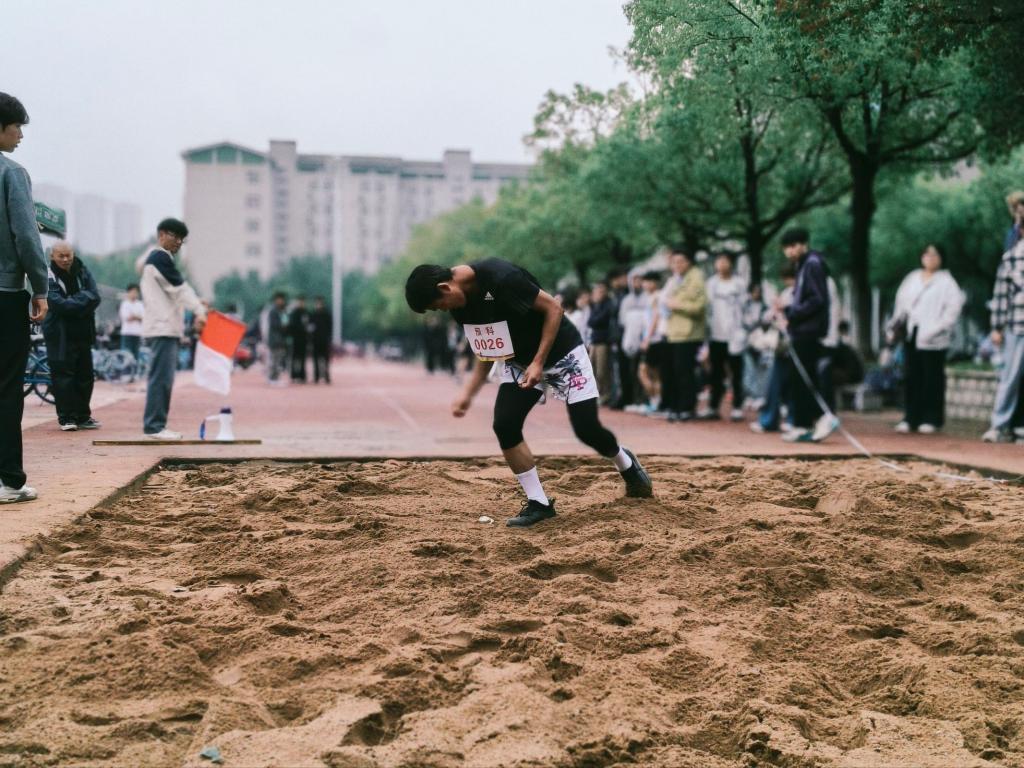 聚焦跳远比赛现场:助跑加速裹挟着风声,踏跳蹬地迸发强劲动能。腾空瞬间划出修长轨迹,沙坑中溅起的沙粒与腾空姿态相映,落地时的沉稳落点,定格成超越极限的赛场剪影,掌声随沙粒一同飞扬。