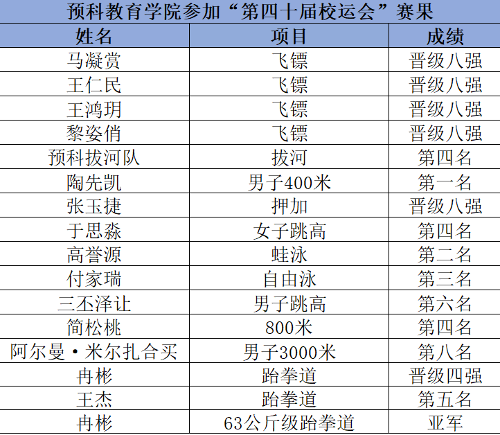 在赛场上,预科的运动健儿们各展风采,佳绩频传。拔河比赛斩获第四名;女子跳高比赛于思淼取得第四名;蛙泳小组赛高誉源取得第二名;自由泳小组赛付家瑞取得第三名;男子跳高比赛三丕泽让冲击1.60m拿下第六名;3000米比赛阿尔曼获得第八名;跆拳道赛场,冉彬在63公斤级晋级四强并最终斩获亚军。