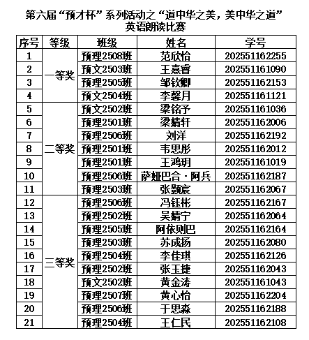 (图为第六届“预才杯”系列活动之“道中华之美,美中华之道”英语朗读比赛获奖名单)