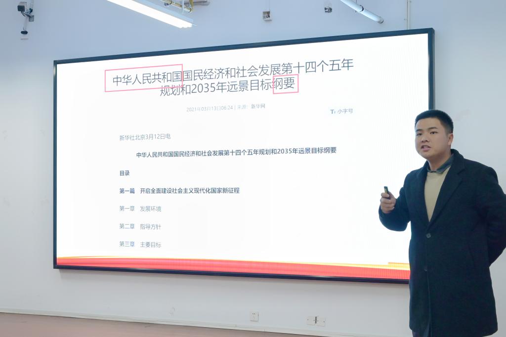 本次团课共分为两个部分,基本理论和重要政治论述。陶恒老师在团课之初提出了一个思考问题,让同学们从生活里找寻体现“中国共产党的领导是中国特色社会主义最本质的特征。”“党政军民学,东西南北中,党是领导一切的。”的案例。引导同学们对党的重要性进行深度思考,激发对党理论知识的探索心理。通过对习近平总书记重要文件和十四五发展规划的解读,再次重申学习党的理论知识的重要性。紧接着到了本次团课学习的两大核心板块。