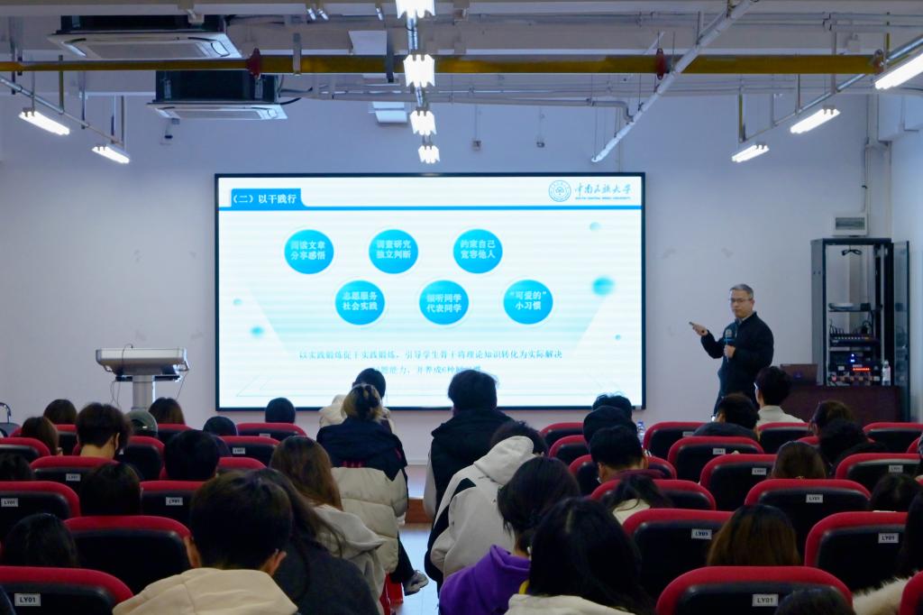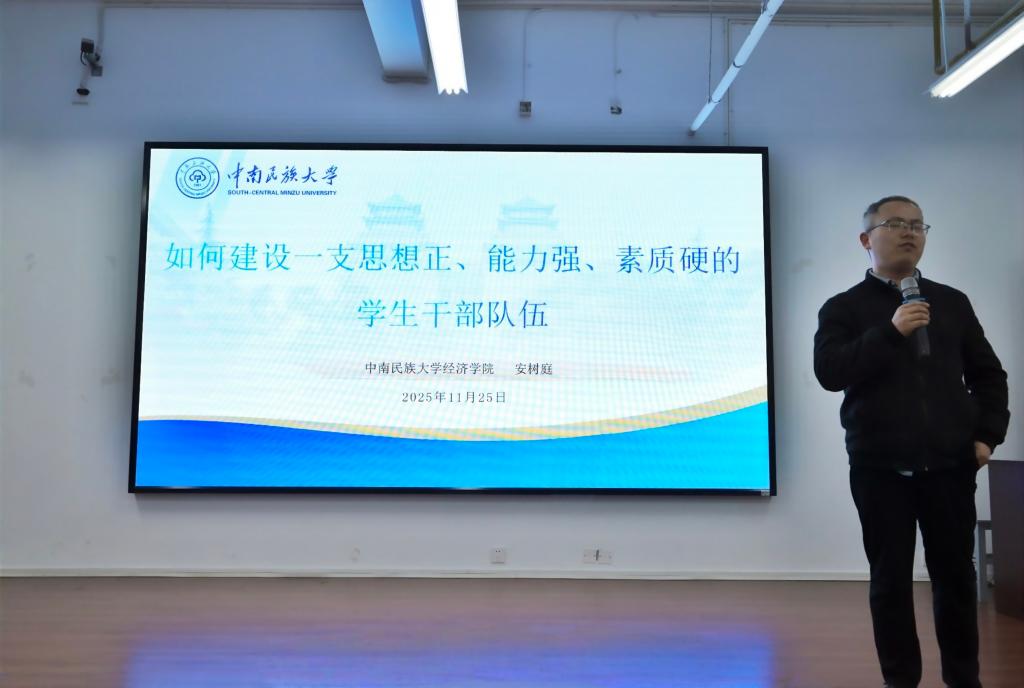 课程开篇,安树庭老师立足共青团作为党的助手和后备军的政治定位,明确学生干部是连接学院与学生的“桥梁纽带”,其思想觉悟直接关系团学工作的政治方向与实施成效。作为长期深耕学生骨干培养领域的教育工作者,他结合经济学院学生干部培养实例,以预科分流学子在团学工作中表现突出并成长为2024级首批入党学生的案例,生动阐释了“以党性教育引领团干部成长”的培养理念,为全场团学干部树立了“从团员骨干到入党积极分子”的成长标杆。