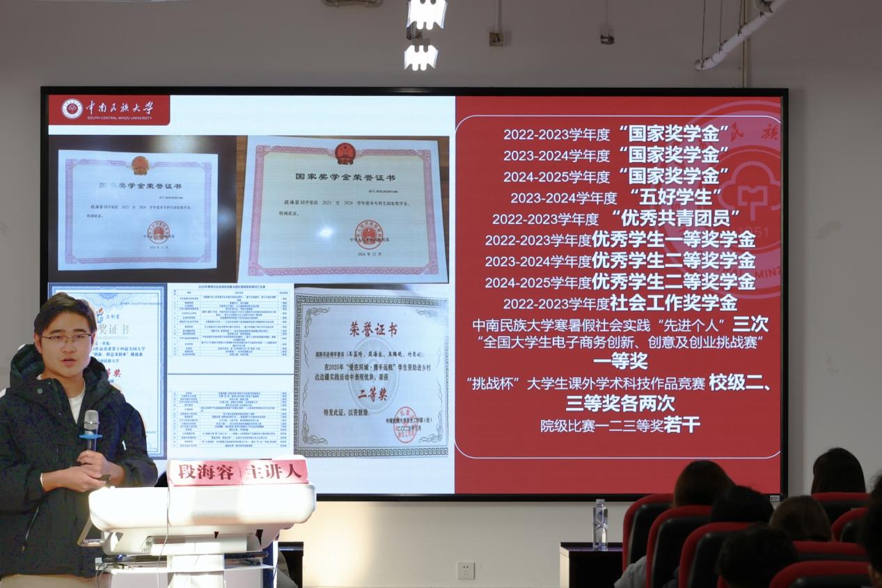 紧接着,民族与社会学学院的段海容学长聚焦专业选择与保研规划两大核心话题展开分享。段海容学长不仅连续三年斩获国家奖学金,主持的大创项目优秀结项,深度参与社科基金项目,更有论文登上《中国民族报》、主导拍摄的纪录片入选 “学习强国” 平台,各类竞赛奖项拿到手软。他提出,专业选择应锚定兴趣导向,将个人爱好转化为持久学习动力,进而实现深度的专业认同。针对文史类专业学习,他强调有效阅读积累的重要性,建议新生设定明确读书目标,并撰写结构化读书报告。谈及保研,他指出要提前明确方向定位,结合学校声誉、专业特色与区位优势等要素精准发力,同时详细解析了保研流程、准备工作及核心要求。他寄语新生,要重视实地考察、建立短期目标,专注当下、持续积累,以充实的自我静待机会降临。