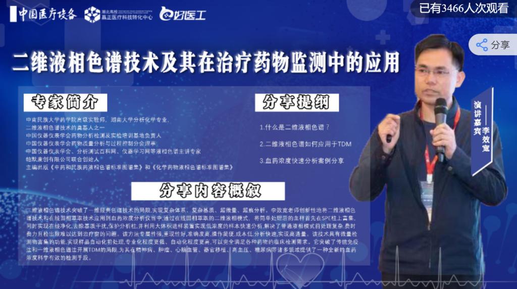 李效宽老师详细介绍了二维液相色谱技术原理及其在治疗药物监测中的应用现状和前景,该技术具有微量检测物富集的功能,实现样品自动化前处理,专业化程度更强、自动化程度更高,可以完全满足各种药物的临床检测需求。该技术的应用解决了血药浓度监测前处理复杂,费时费力且难以达到治疗窗的问题,突破了传统免疫法和一维色谱质谱法开展TDM的局限,为在精神病、肿瘤、心脑血管、器官移植、高血压、糖尿病等诸多疾病治疗领域提供了一种全新的血药浓度科学有效检测手段。李效宽老师主持开发的高端血药浓度分析仪器已经获得国家医疗器械注册证书,作为高端精密仪器替代进口,服务于国家医疗民生健康的战略安全需要。