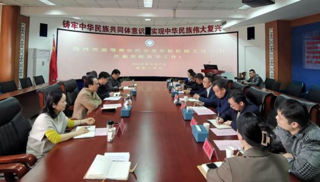 3月7日下午,鄂州市民宗委调研组一行9人在副主任吴柏松带领下来本基地和研究院调研铸牢中华民族共同体意识工作情况,并与研究院班子成员举行座谈。座谈会由院党总支书记汤振华主持。