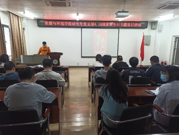 今年的4月15日是第七个全民国家安全教育日,为深入贯彻落实习近平总书记关于总体国家安全观精神,2022年4月14日上午,资源与环境学院研究生党支部在13号楼261报告厅组织召开扩大的“国家安全”支部主题党日活动。本次活动由学院研究生党支部副书记苏海岚同志主持,学院全体在校研究生参与了此次活动。会议伊始,苏海岚同志向大家讲解了什么是总体国家安全观,并强调人民安全是国家安全的宗旨。